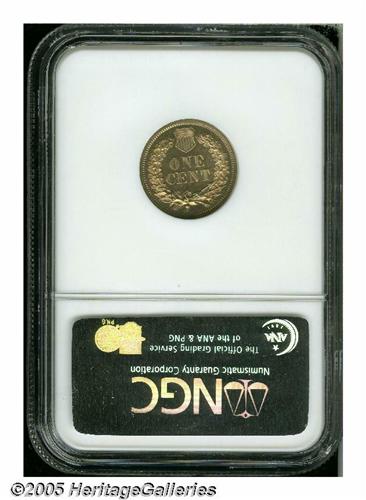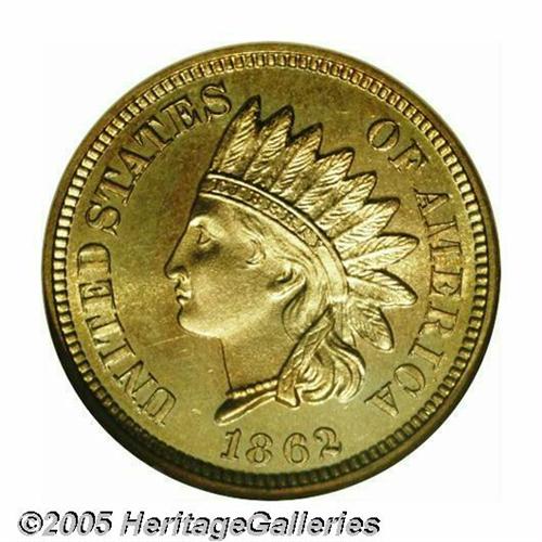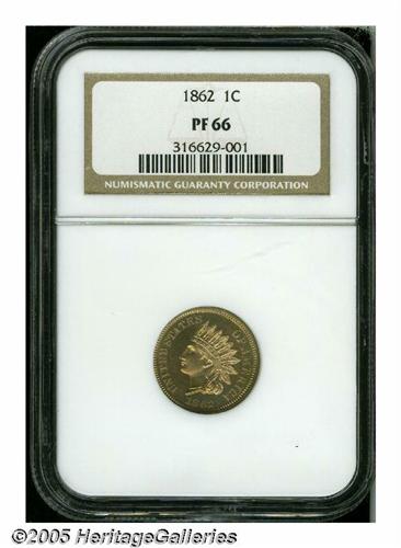 <B>1862<1C> PR66 NGC.</B></I> Peach and lime colors adorn this intricately struck premium Gem. Immaculate save for an inconspicuous pinscratch concealed within the headdress above LIBERTY. High grade proof Copper Nickel Cents are very scarce, even more so than the low mintages suggest, since many proofs from the era were melted as unsold. Population: 31 in 66, 6 finer (3/05).