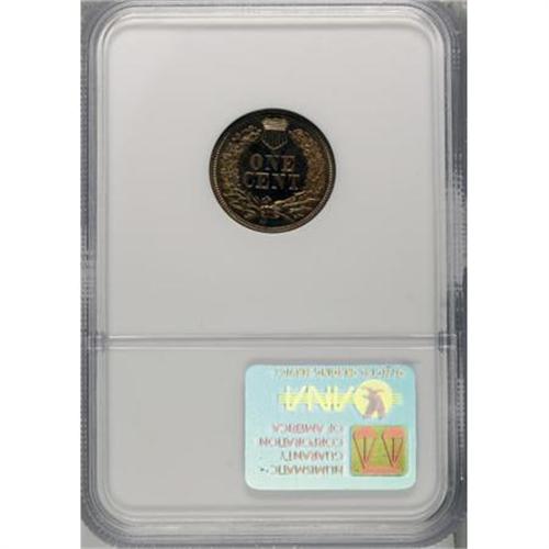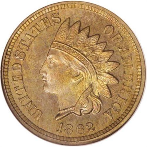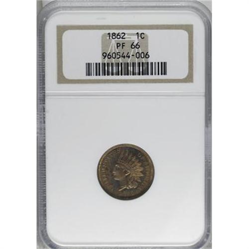 <B>1862 1C PR66 NGC.</B></I> It has often been noted, by Rick Snow and others, that this is the most common issue in proof of the 1859-1864 set of copper-nickel Indian cents. From an original mintage of 550 pieces, at least half seem to survive today. Potential bidders should recognize, however, that the number of Premium Gems is small, while the number of even finer examples is minuscule. Well struck on all of the design elements, this piece displays suitably reflective fields and a pleasing array of variegated colors that includes orange, peach, gold, and chartreuse. Surface distractions are absent.<I><BR>From The Santa Fe Collection.</B></I><BR><BR><B>Coin Engraver:</B> James B. Longacre<BR><BR><b>Shipping:</b> Coins & Currency (<a target="_blank" href="http://www.heritageauctions.com/common/shipping.php">view shipping information</a>\)