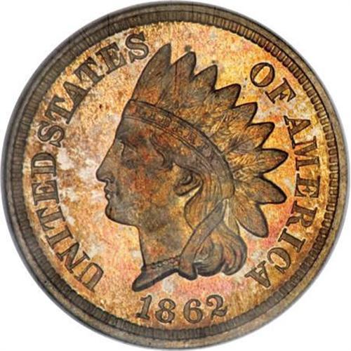 <B>1862 1C PR66 NGC. CAC.</B></I> It has often been noted, by Rick Snow and others, that this is the most common issue in proof of the 1859-1864 set of copper-nickel Indian cents. From an original mintage of 550 pieces, at least half seem to survive today. Potential bidders should recognize, however, that the number of Premium Gems is small, while the number of even finer examples is minuscule. This boldly impressed piece displays suitably reflective fields and a pleasing array of variegated colors that includes orange, peach, gold, and chartreuse.<BR><I>From The Santa Fe Collection, Part Two.</B></I><BR><BR><B>Coin Engraver:</B> James B. Longacre<BR><BR><b>Shipping:</b> Coins & Currency (<a target="_blank" href="http://www.heritageauctions.com/common/shipping.php">view shipping information</a>)