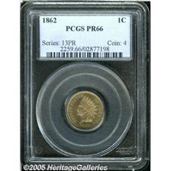 <B>1862 1C PR66 PCGS.</B></I> Coins of this issue that grade as fine as PR66 are not at all common. This is among the most attractive examples that this cataloger has seen, both sides are fully struck with lovely, smooth, tan color. There are a handful of small carbon spots on the obverse, and a couple of even smaller spots on the reverse, but there are no marks that would call into question the validity of the assigned grade. Population: 30 in 66, 1 finer (2/05).