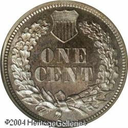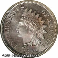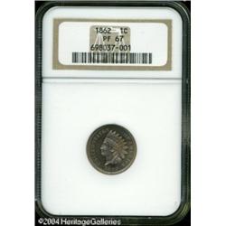 1862 1C PR67 NGC. The 1862 is one of the more avai <B>1862 1C PR67 NGC.</B></I> The 1862 is one of the more available dates in the copper-nickel series and it is also one of the better produced issues. This piece represents the best of the best. The fields are deeply mirrored, impressively so for a copper-nickel product, and the surfaces are nearly perfect. Beautifully toned, each side displays original red with lilac-lavender patina interspersed. A wonderfully preserved and visually pleasing proof coin. Population: 6 in 67, 0 finer (11/04). <BR><BR><B>Important notice:</B> Heritage usually auctions material at the rate of 200-250 lots per hour. On some occasions eBay Live bid software or the Internet may not be able to keep up with the pace of the auction. We recommend placing a realistic absentee bid now as insurance to avoid disappointment. Occasionally the auctioneer may eliminate or reject an eBay Live bid, and the auctioneer may also reopen a lot after the close of the eBay live bidding (usually because we missed an audience bid), and may reject your bid even if it shows you as the winning bidder. By bidding via eBay Live, you agree that Heritage may award the lot to another bidder at its sole discretion under the circumstances described above or any other reasonable circumstances. Since eBay bids are not shown to us until we open the lot on the floor, we treat those bids just like floor bids. In most cases the floor responds before the eBay bid is presented to us, due to Internet lag time, so for consistency we have made it a policy that floor bids are always considered first over tie eBay live bids. Also please note that all Heritage lots purchased through eBay Live carry a 20% Buyer's Premium. Please make sure you read the Terms and Conditions before you bid. This lot is being auctioned in conjunction with a live floor auction by Heritage Galleries & Auctioneers. All final auction and invoice information will be supplied by Heritage Galleries & Auctioneers, and all other information should be considered preliminary. Lot:5113