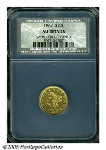 <B>1862<$2 1/2> AU Details, Improperly Cleaned, NCS.</B></I> The 1862 is quite scarce in al grades, and very rare in Mint State. the surfaces of this piece are bright yellow-gold, and display traces of luster in the protected areas. Minute contact marks are scattered over each side, as are wispy hairlines.