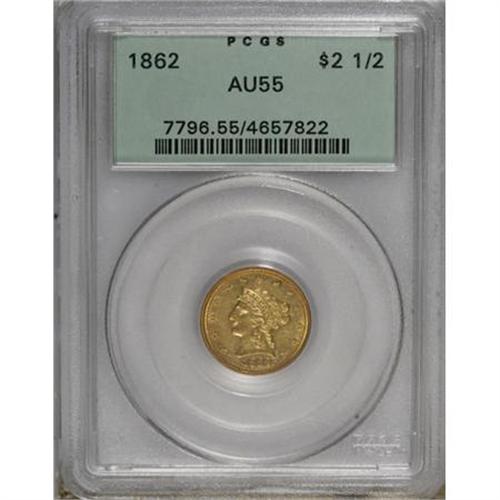 <B>1862 $2 1/2 AU55 PCGS.</B></I> . PCGS Population (10/33). NGC Census: (13/101). Mintage: 98,543. Numismedia Wsl. Price for NGC/PCGS coin in AU55: $585. (#7796)<BR><BR><B>Coin Engraver:</B> Christian Gobrecht<BR><BR><b>Shipping:</b> Coins & Currency (<a target="_blank" href="http://www.heritageauctions.com/common/shipping.php">view shipping information</a>)