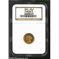 1862 $2 1/2 MS60 NGC. The suspension of specie payments on December 28, 1861 and the subsequent flight from Northern circulation of most coinage does not seem to have had too much of a deleterious effect on production of the 1862 Quarter Eagle. True, the original mintage of 98,543 pieces (curiously, Akers and Breen report the mintage as 112,353 pieces) is substantially less than that of the 1861 (1.2 million coins), but it is still more than that of the other three P-mint Quarter Eagles produced during the Civil War. The suspension of specie payments does, however, seem to explain this issue's poor rate of survival. It is probable that most 1862 Quarter Eagles were exported and/or melted after having been withdrawn from circulation. An important survivor, this Uncirculated representative exhibits warm copper-gold color that brightness to golden-rose hues at direct angles. There is not an excessive number of abrasions for the grade, and modest hints of brightness are seen as the coin turns into the light. A boldly struck survivor of this underrated P-mint rarity. Important notice: We expect to be auctioning lots at the rate of 200-250 per hour. Sometimes eBay Premier live bid software cannot keep up with that pace, so we strongly recommend that you place a realistic proxy bid now as insurance to avoid disappointment. Also please note that all Heritage/CAA lots purchased through eBay Premier carry a 20% Buyer's Premium. Please make sure you read the Terms and Conditions.
