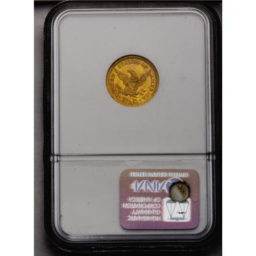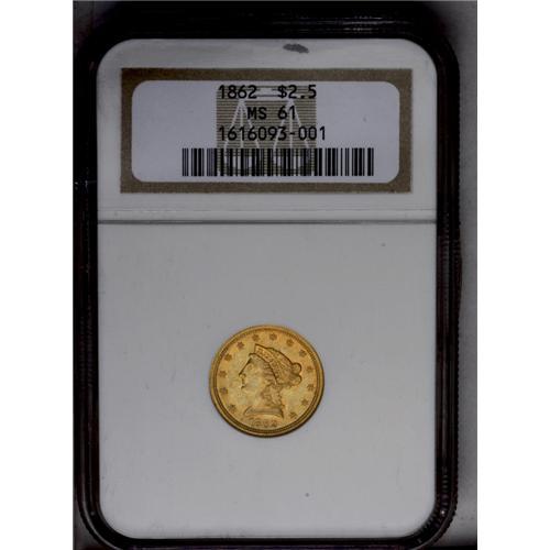 <B>1862<$2 1/2> MS61 NGC.</B></I> Rich peach-gold surfaces display lime-green accents, which are more prevalent on the obverse. The design features are well impressed, though the hair at Liberty's ear is a trifle soft. Some unobtrusive marks are located on the chin.
