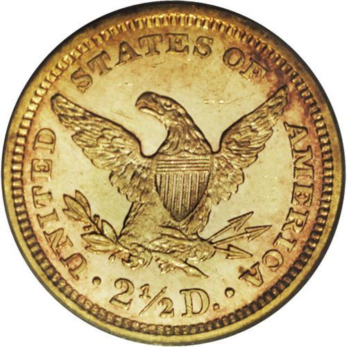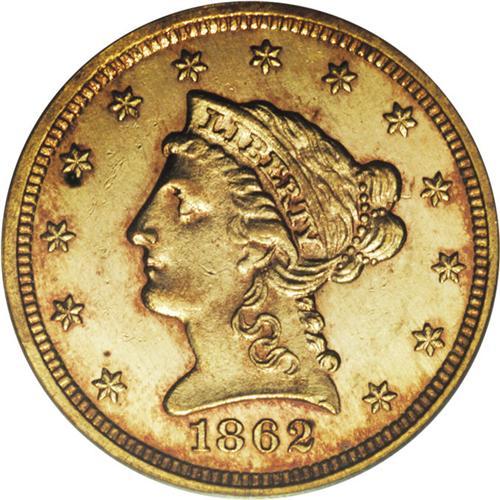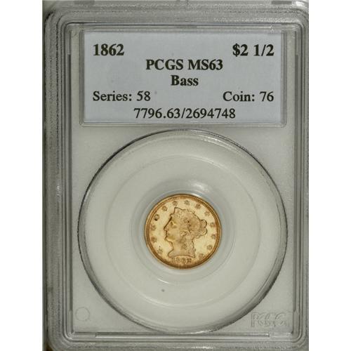 <B>1862 $2 1/2 MS63 PCGS.</B></I> Ex: Bass. An original example with orange-gold margins and prooflike fields. A crisp strike, with slight softness on the forehead curls and the eagle's left (facing) leg. Fewer than 100,000 pieces were struck, quite a reduction from the mintage of more than 1.2 million pieces in 1861. Population: 8 in 63, 3 finer (11/06).<BR><BR><b>Shipping:</b> Coin/Currency (<a target="_blank" href="http://www.heritageauctions.com/common/shipping.php">view shipping information</a>)