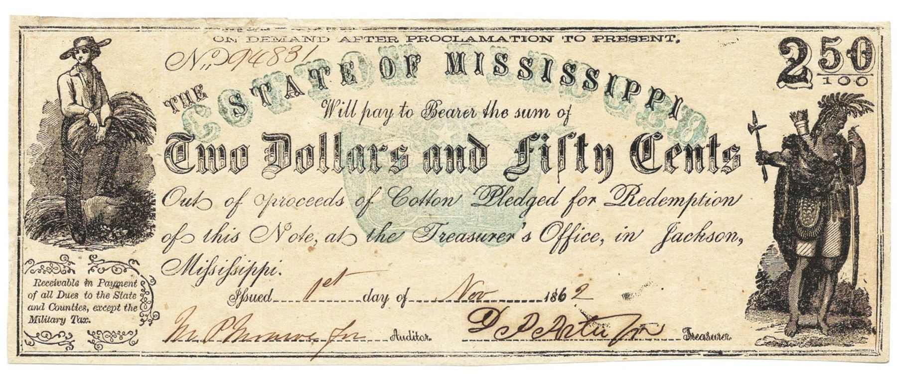 One 1862 $2.50 Jackson, MS Bank Note