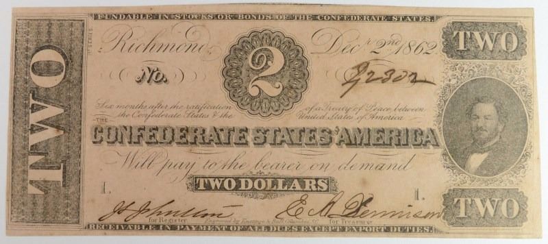 1862 $2 CONFEDERATE STATES AMERICA NOTE T-54 #42302 CH, AU FOUR FULL MARGINS