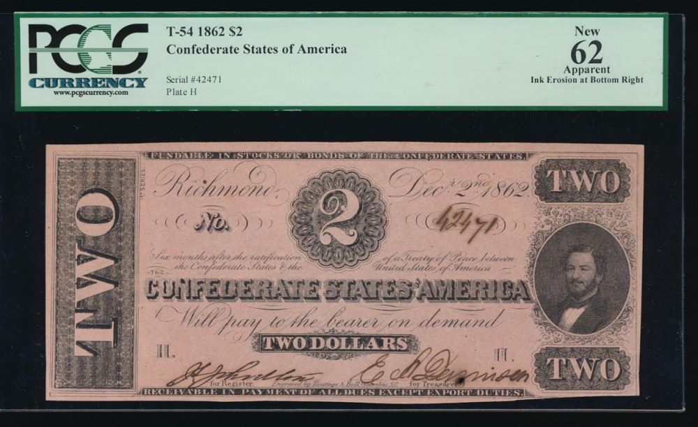 One 1862 $2 Confederate States of America Note PCGS 62.