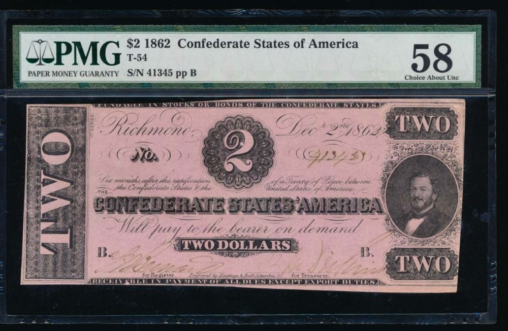 One 1862 $2 Confederate States of America Note PMG 58.