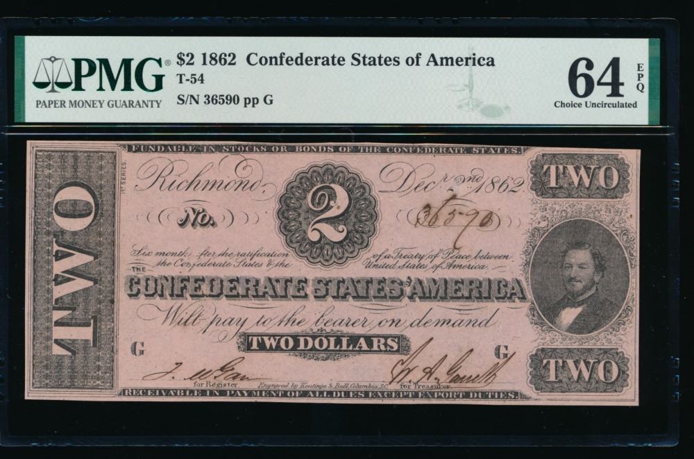 One 1862 $2 Confederate States of America Note PMG 64EPQ.