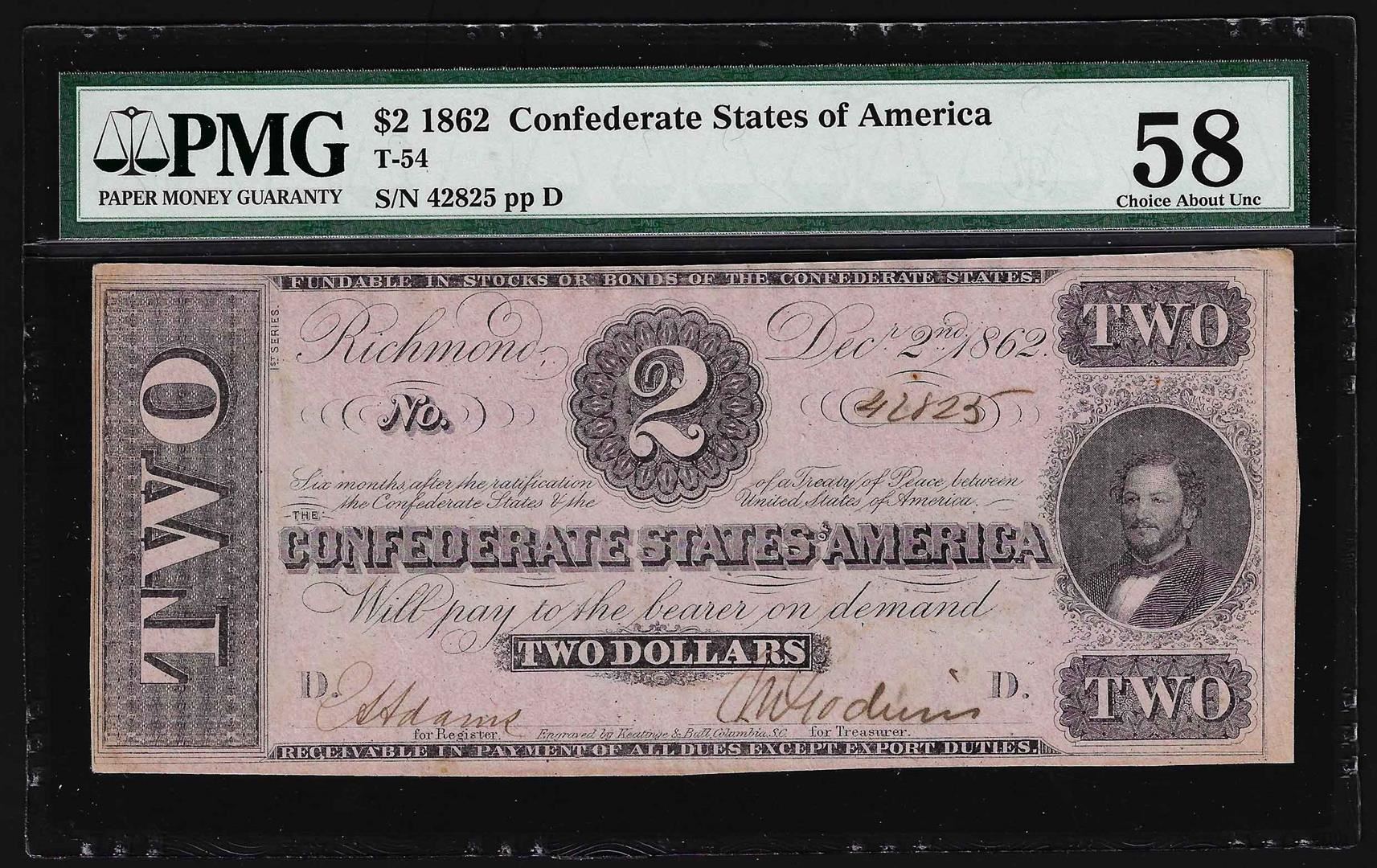 One 1862 $2 Confederate States of America Note PMG Choice AU58. PMG Certified.