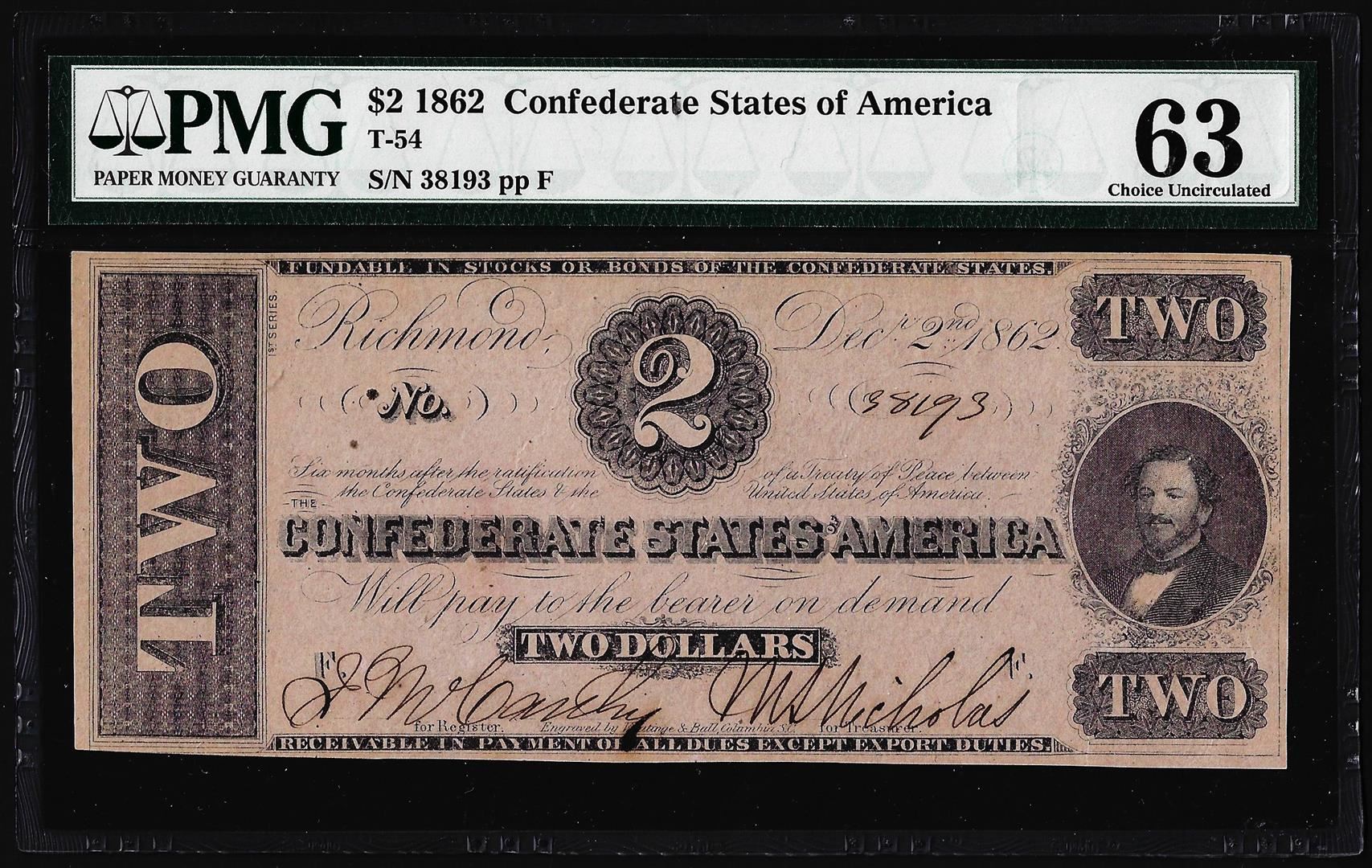 One 1862 $2 Confederate States of Note T-54 PMG Choice Uncirculated 63. PMG Certified.