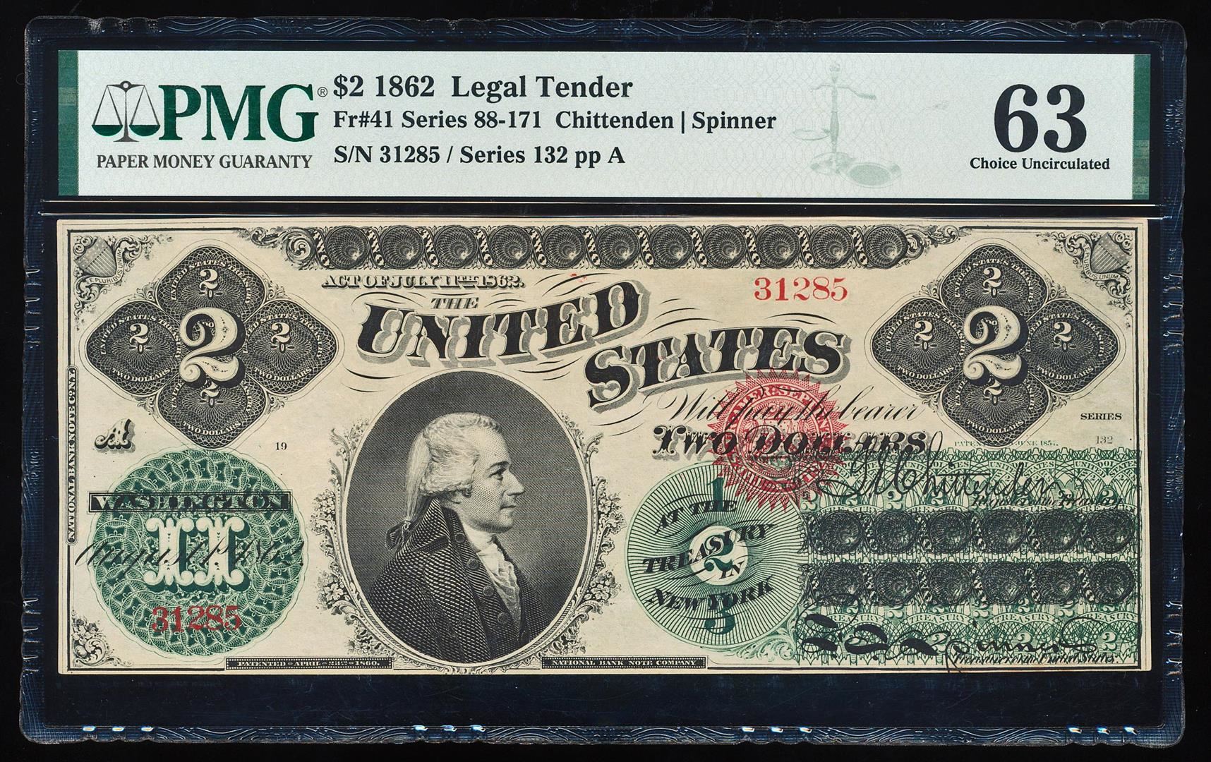 One 1862 $2 Legal Tender Note Fr.41 PMG Choice Uncirculated 63. PMG Certified.