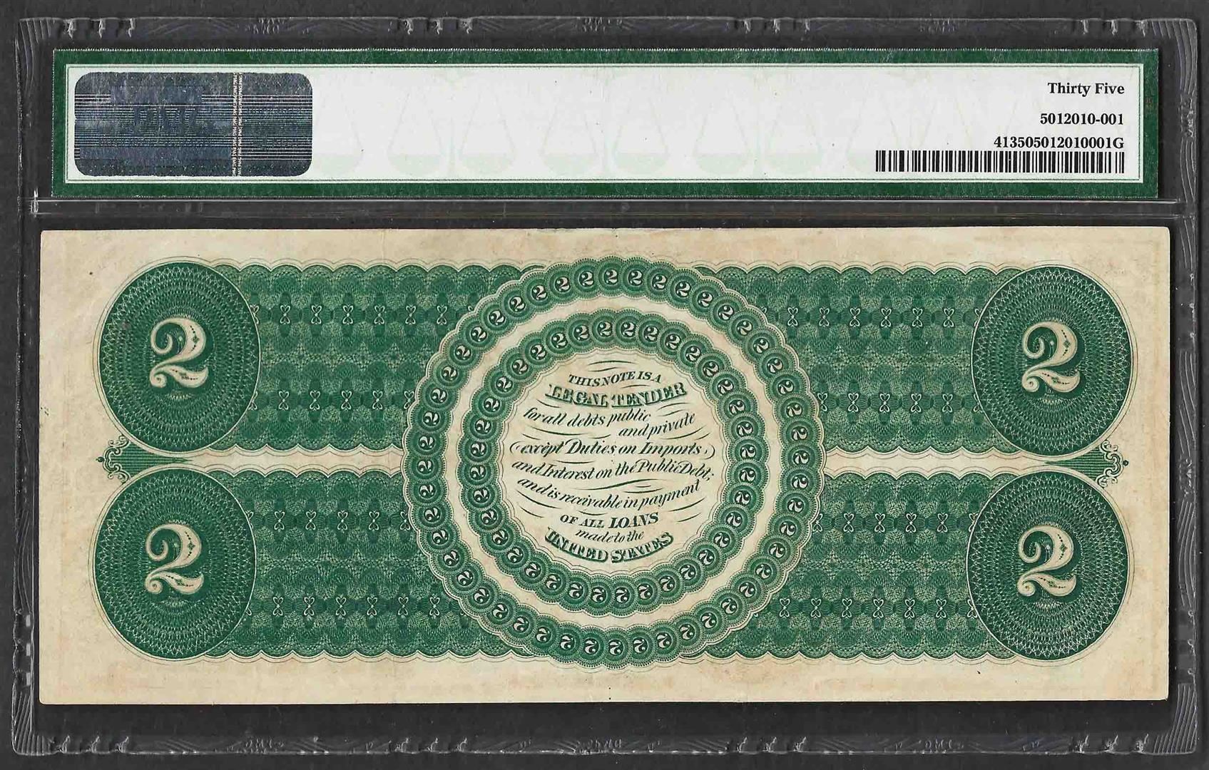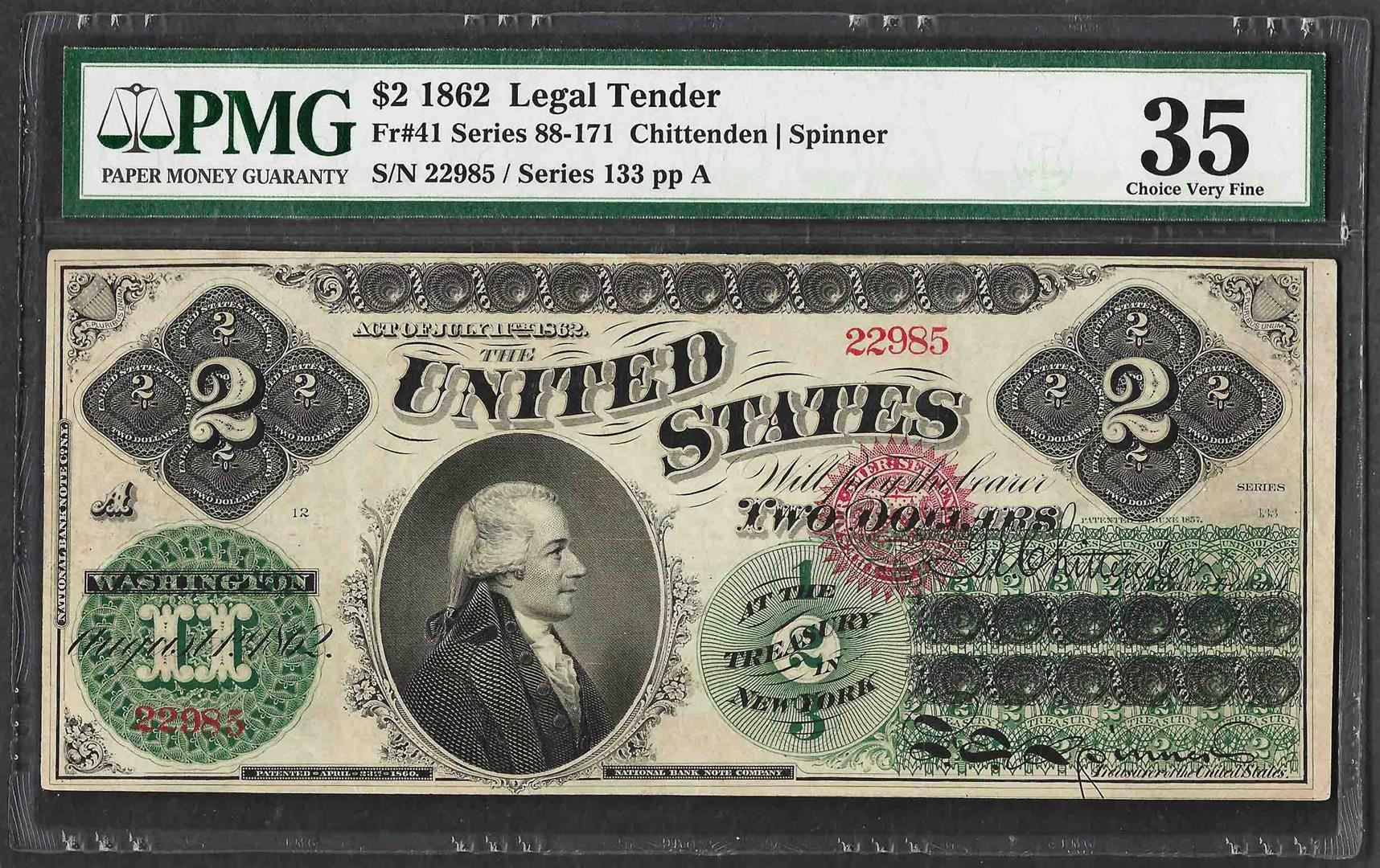 One 1862 $2 Legal Tender Note Fr.41 PMG Choice Very Fine 35. PMG Certified.