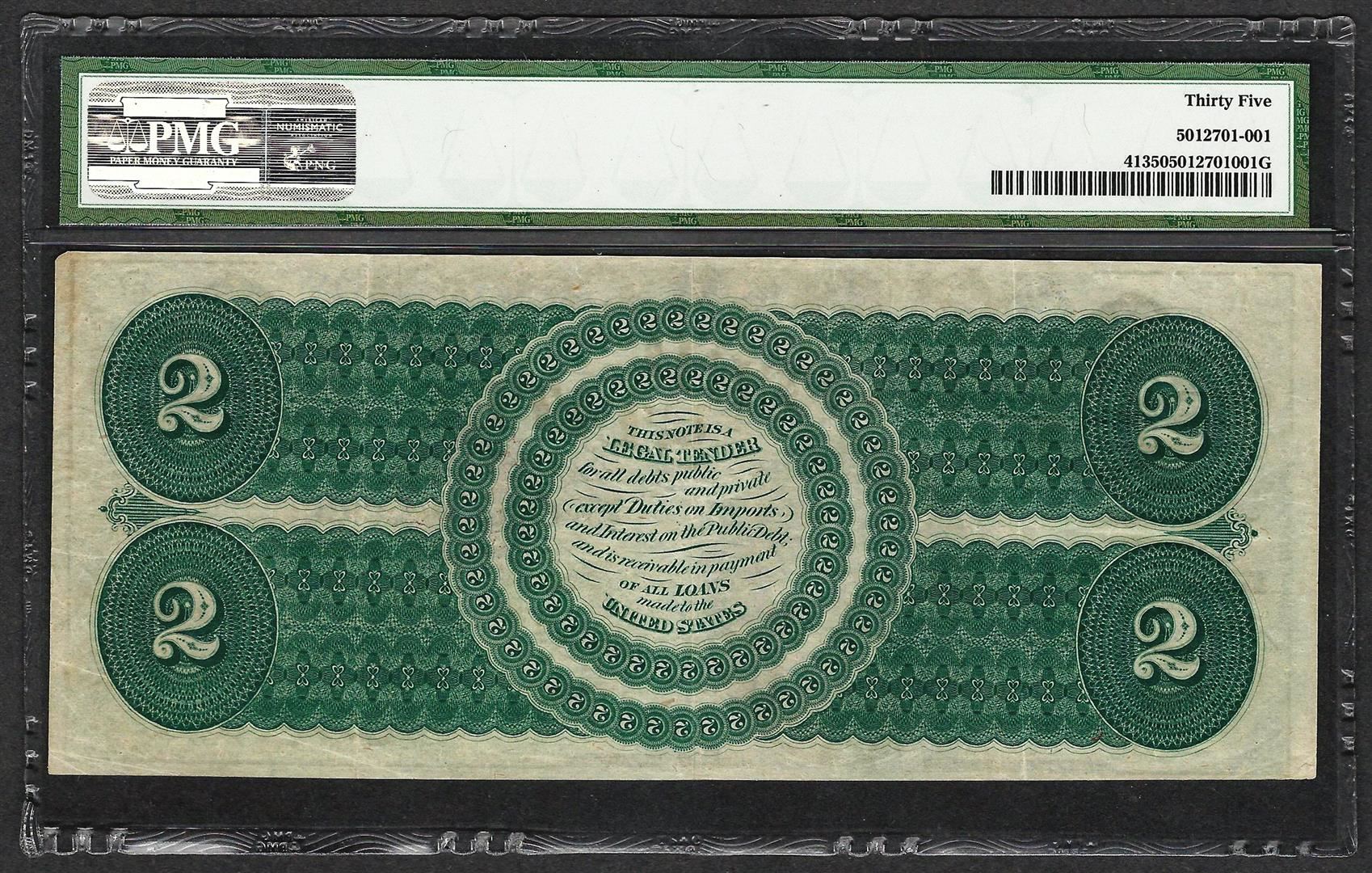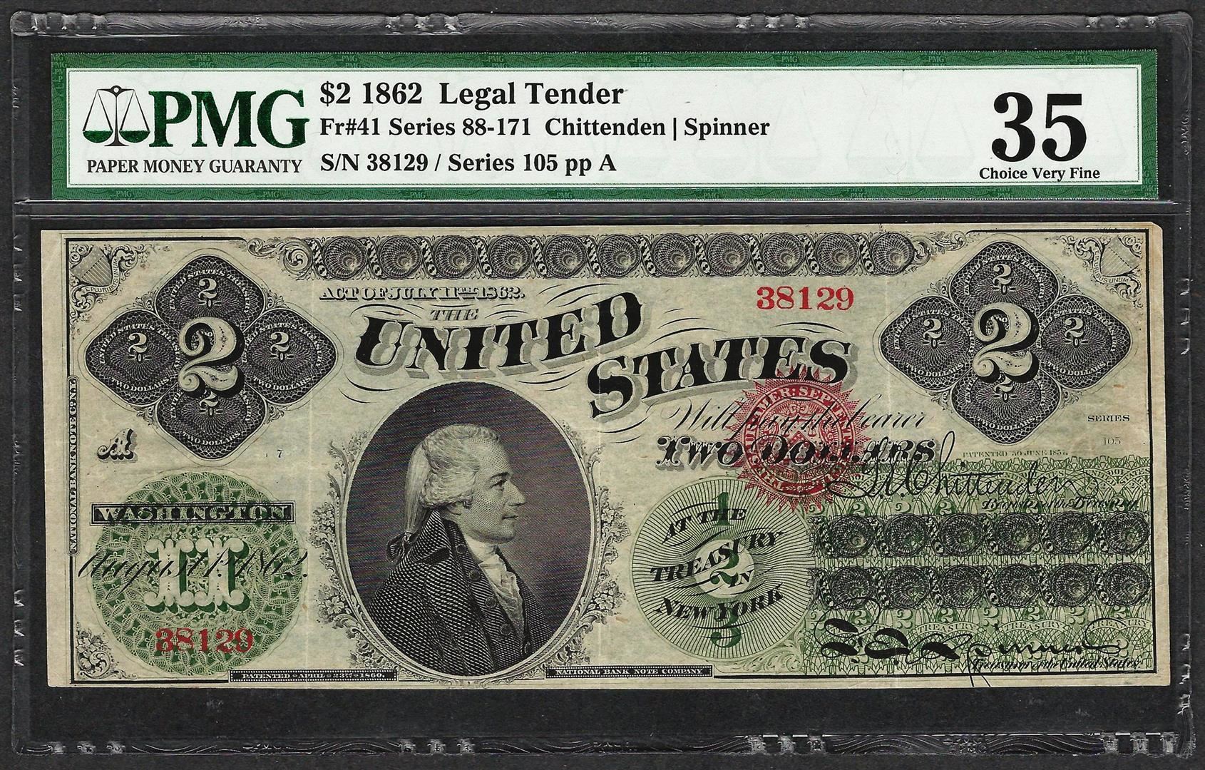 One 1862 $2 Legal Tender Note Fr.41 PMG Choice Very Fine 35. PMG Certified.