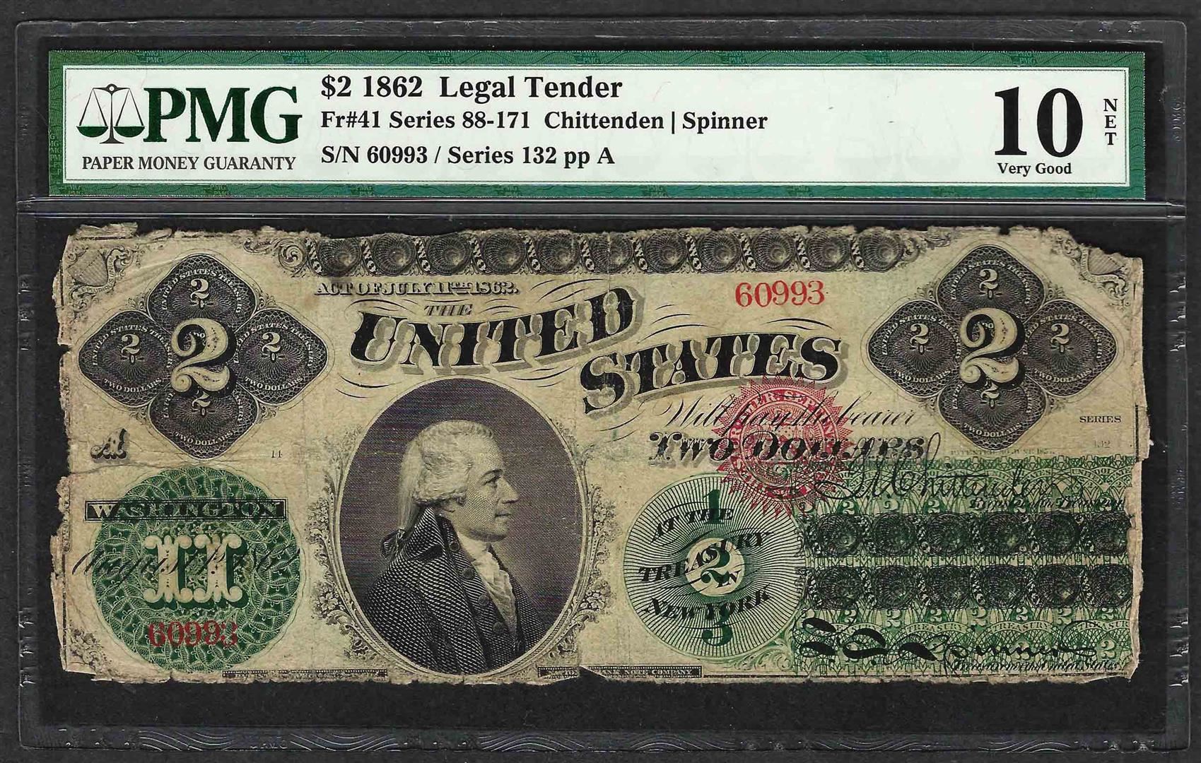 One 1862 $2 Legal Tender Note Fr.41 PMG Very Good 10 Net. PMG Certified.