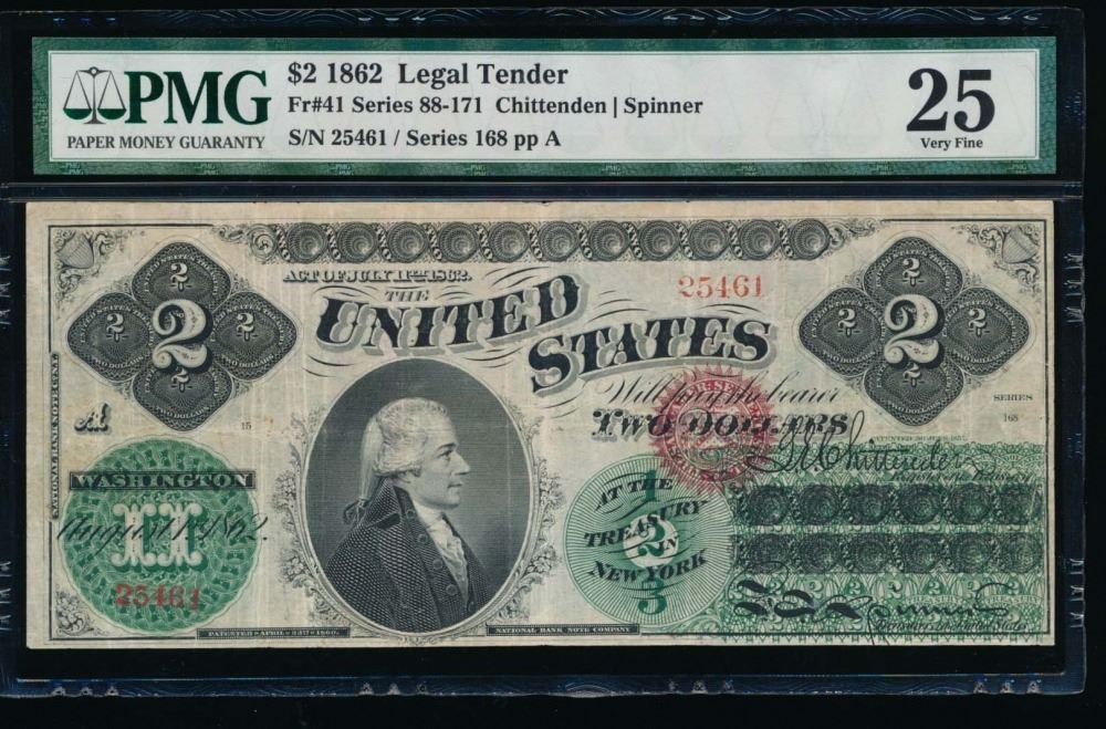 One 1862 $2 Legal Tender Note PMG 25.