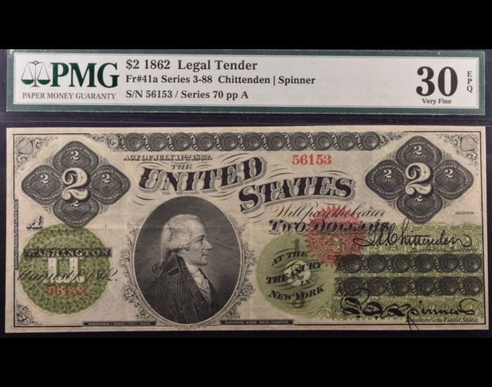One 1862 $2 Legal Tender Note PMG 30EPQ.