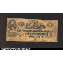 1862 $2 Personification of South Striking Down Union in center; J.P. Benjamin on left; "2" and "TWO" in Green Overprint, T-43, VG+. A nice circulated example of this variety with the green "TWO" overprint.