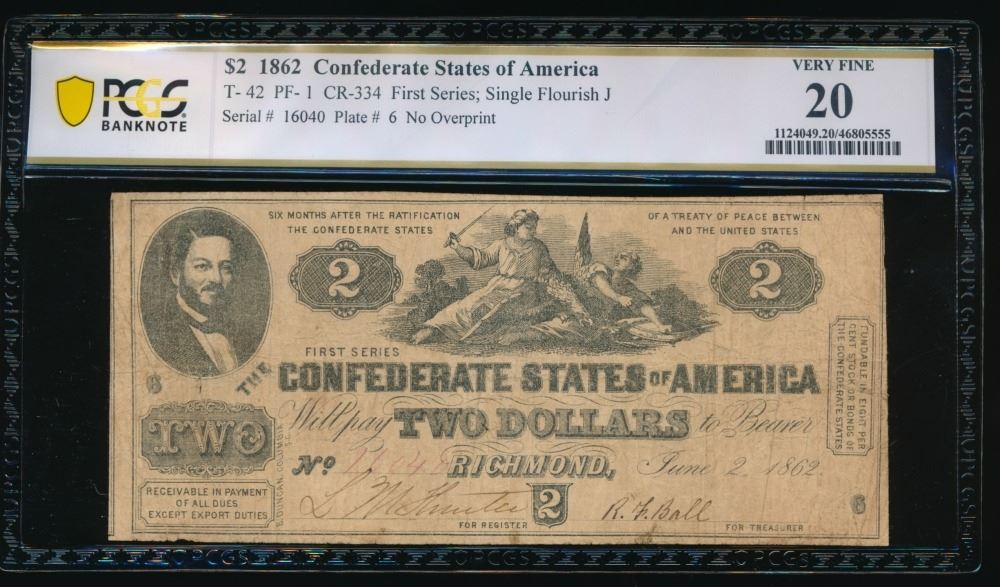 One 1862 $2 T-42 Confederate PCGS 20.