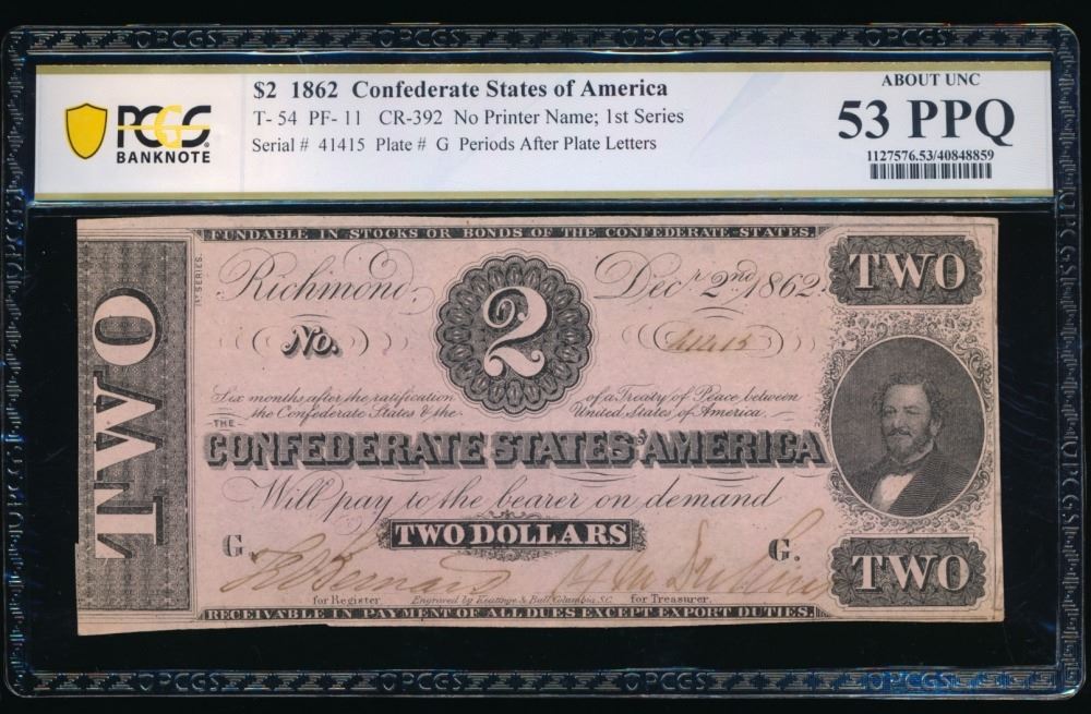 One 1862 $2 T-54 Confederate PCGS 53PPQ.