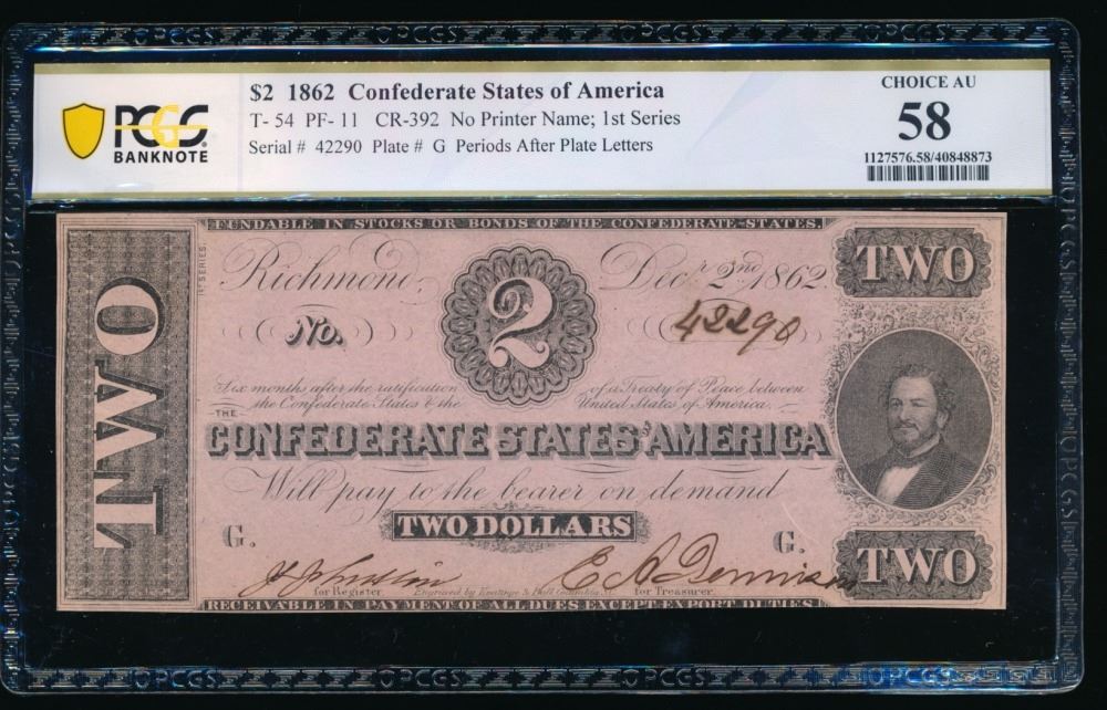 One 1862 $2 T-54 Confederate PCGS 58.