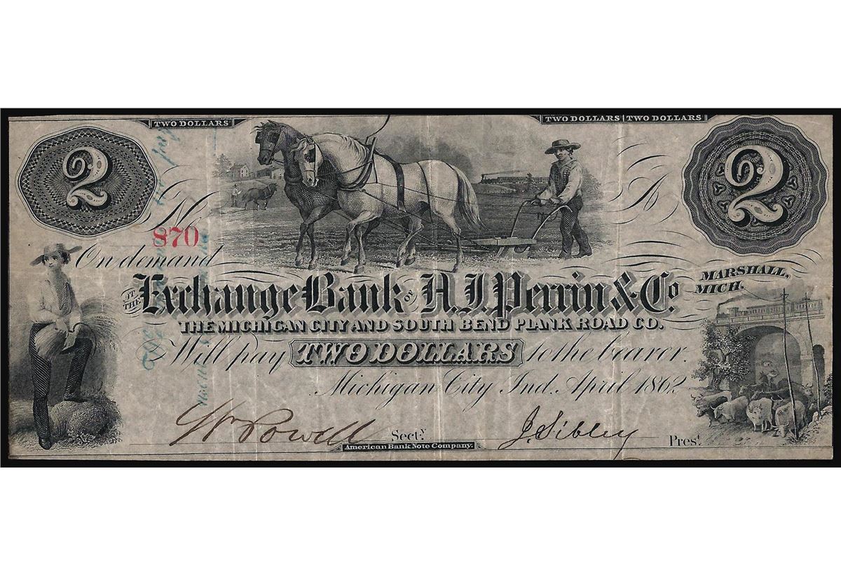 One 1862 $2 The Exchange Bank- A.J. Perrin & Co Obsolete Note.