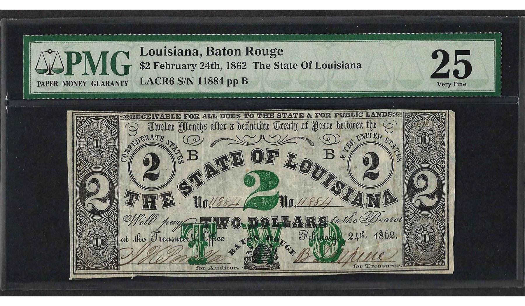 One 1862 $2 The State of Louisiana Obsolete Note PMG Very Fine 25. PMG Certified.