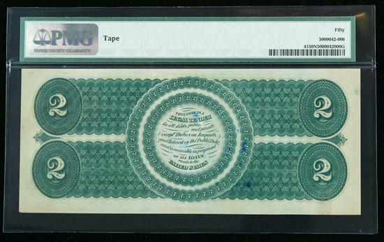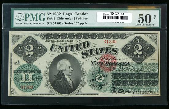 1862, $2 United States Note. PMG Net About Uncirculated 50. . Fr-41. This early Greenback $2 has lovely eye appeal, but as noted by PMG there is a tape repaired edge repair near the bottom left corner. In addition, a few closed pinholes are noticed near the center of the note and are mentioned purely for accuracy. This piece could prove quite a bargain, as it offers a great "look" for what could prove to be a slightly discounted price.