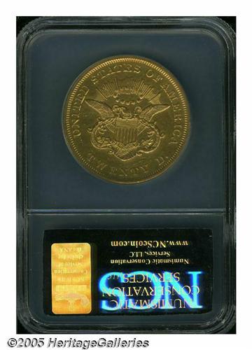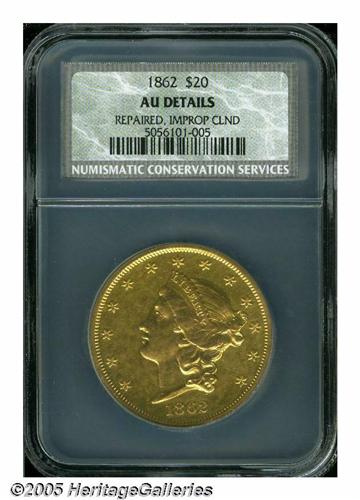 <B>1862<$20> AU50 Repaired, Improperly Cleaned, NCS.</B></I> Muted golden surfaces with numerous light hairlines and evidence of smoothing in the obverse fields. None-the-less, a reasonably nice lightly circulated example of this tough Civil War issue.