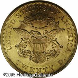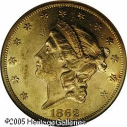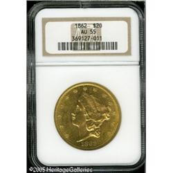<B>1862 $20 AU55 NGC.</B></I> A very elusive date in high grades, and few were saved in grades that approach mint state. Fully and completely struck by the dies, and some luster remains in the protected areas of the fields. Moderate handling marks and nicks are found with a glass, and Liberty's cheek shows several contact marks, typical for these large gold coins. A low mintage date with 92,133 coins struck for circulation, the vast majority melted long ago. Population: 3 in 55, 27 finer (1/05). Lot:9006