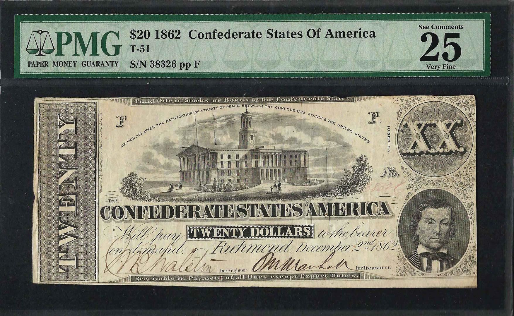 1862 $20 Confederate States of America Note T-51 PMG Very Fine 25 Canceled