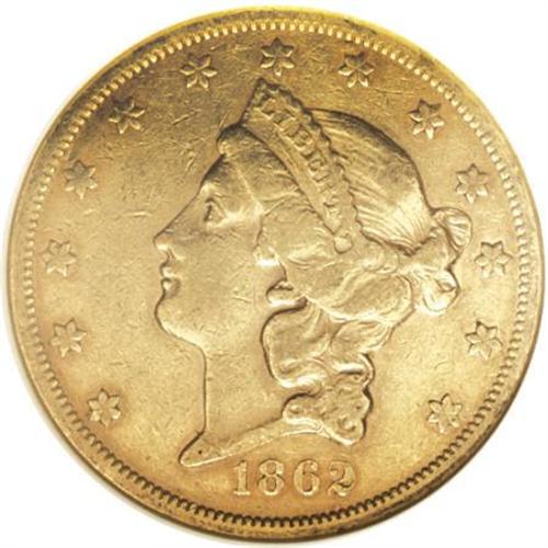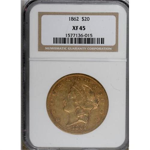 <B>1862 $20 XF45 NGC.</B></I> A scarce Civil War issue, many of the 92,098 pieces struck were shipped to Europe where paper money was not welcome, as pointed out in Bowers' reference on this denomination. This coin was handled, however, as it shows even wear over the highpoints and numerous abrasions in the fields. Deep reddish color is seen over each side.<BR><BR><B>Coin Engraver:</B> James B. Longacre<BR><BR><b>Shipping:</b> Coins & Currency (<a target="_blank" href="http://www.heritageauctions.com/common/shipping.php">view shipping information</a>)