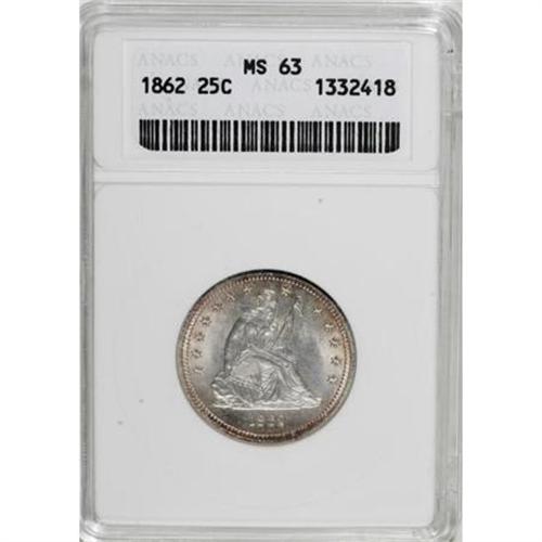 <B>1862 25C MS63 ANACS.</B></I> NGC Census: (15/50). PCGS Population (27/54). Mintage: 932,000. Numismedia Wsl. Price for NGC/PCGS coin in MS63: $600. (#5456)<BR><BR><B>Coin Engraver:</B> Christian Gobrecht<BR><BR><b>Shipping:</b> Coins & Currency (<a target="_blank" href="http://www.heritageauctions.com/common/shipping.php">view shipping information</a>)