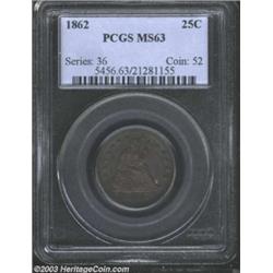 <TABLE cellSpacing=0 cellPadding=0 width="100%" bgColor=#000000 border=0><TBODY><TR><TD width="100%"><TABLE cellSpacing=1 cellPadding=3 width="100%" border=0><TBODY><TR><TD width="100%" bgColor=#79735c><FONT face=arial color=#ffffff size=3><B>Description</B> </FONT></TD></TR><TR><TD width="100%" bgColor=#ffffff><FONT face=arial size=2><B>1862 25C MS63 PCGS.</B></I> Richly toned in violet and sea-green shades, with a few abrasions in the left obverse field that are well concealed by the toning. The strike on this scarcer Civil War era issue is well executed throughout. </FONT></TD></TR></TBODY></TABLE></TD></TR></TBODY></TABLE><BR><A name=PricesRealized></A><TABLE cellSpacing=0 cellPadding=0 width="100%" bgColor=#000000 border=0><TBODY><TR><TD width="100%"><TABLE cellSpacing=1 cellPadding=3 width="100%" border=0><TBODY><TR><TD width="100%" bgColor=#79735c><A name=PR><FONT face=arial color=#ffffff size=3><B>Previous Prices from Heritage Auctions</B> </FONT></A></TD></TR><TR><TD bgColor=#f6f6ed><TABLE cellSpacing=0 cellPadding=0 width="100%" border=1><TBODY><TR><TD align=middle width="33%"><B>Date</B></TD><TD align=middle width="33%"><B>Service</B></TD><TD align=middle width="33%"><B>Price</B></TD></TR><TR bgColor=whitesmoke><TD width="33%"><B>01/05/2001</B></TD><TD width="33%">PCGS</TD><TD width="33%">$603.75</TD></TR><TR bgColor=whitesmoke><TD width="33%"><B>02/13/1999</B></TD><TD width="33%">ANACS</TD><TD width="33%">$550.00</TD></TR></TBODY></TABLE></TD></TR><TR><TD bgColor=#ffffff><FONT face=arial size=1 ?>PLEASE NOTE: All prices realized reflect the final hammer price PLUS the buyer's premium in auctions that charge a buyer's premium. Each item has a notation at the top of the listing indicating whether that lot included a buyer's premium. Example: A item that sells with a final hammer price of $100 and a 20% buyer's premium will display with a price realized of $120. All information listed is intended to be as accurate as possible, but errors are possible. Please use this guide carefully and inform us of any inaccuracies. </FONT></TD></TR></TBODY></TABLE></TD></TR></TBODY></TABLE><BR><TABLE cellSpacing=0 cellPadding=0 width="100%" bgColor=#000000 border=0><TBODY><TR><TD width="100%"><TABLE cellSpacing=1 cellPadding=3 width="100%" border=0><TBODY><TR><TD width="100%" bgColor=#79735c colSpan=6><FONT face=arial color=#ffffff size=3><B>Price Guide*</B> </FONT></TD></TR><TR bgColor=#f6f6ed><TD align=middle><B>Grade</B> </TD><TD align=middle><B>Coin World<BR>(Trends)</B> </TD><TD align=middle><B>Numismedia<BR>Retail</B> </TD><TD align=middle><B>Numismedia<BR>Wholesale</B> </TD><TD align=middle><B>Coin<BR>Universe</B> </TD><TD align=middle><B>Heritage<BR>Value Index</B> </TD></TR><TR bgColor=#ffffff><TD align=middle>62</TD><TD align=right>$455.00</TD><TD align=right>$470.00</TD><TD align=right>$392.00</TD><TD align=right>---</TD><TD align=right>$340.44</TD></TR><TR style="FONT-WEIGHT: bold" bgColor=#cccfdd><TD align=middle>63</TD><TD align=right>$575.00</TD><TD align=right>$720.00</TD><TD align=right>$600.00</TD><TD align=right>$575.00</TD><TD align=right>$440.13</TD></TR><TR bgColor=#ffffff><TD align=middle>64</TD><TD align=right>$1,000.00</TD><TD align=right>---</TD><TD align=right>$1,050.00</TD><TD align=right>$1,250.00</TD><TD align=right>$846.88</TD></TR><TR bgColor=#ffffff><TD colSpan=6><FONT size=1>*All information listed is intended to be as accurate as possible, but errors are possible. No item may be returned or refused based on this information which is provided as a service to our customers. You should contact each pricing source directly to determine the accuracy of this information. </FONT></TD></TR></TBODY></TABLE></TD></TR></TBODY></TABLE><BR><TABLE cellSpacing=0 cellPadding=0 width="100%" bgColor=#000000 border=0><TBODY><TR><TD width="100%"><TABLE cellSpacing=1 cellPadding=3 width="100%" border=0><TBODY><TR><TD width="100%" bgColor=#79735c><FONT face=arial color=#ffffff size=3><B>Population Guide</B> </FONT></TD></TR><TR bgColor=#ffffff><TD align=middle><!-- Begin Output of Population Grid--><TABLE cellSpacing=0 cellPadding=0 width="100%" border=0><TBODY><TR><TD vAlign=center><TABLE cellSpacing=0 width="100%" border=1 cellsadding="3"><TBODY><TR><TD vAlign=center><TABLE cellSpacing=0 cellPadding=3 width="100%" border=1><TBODY><TR><TD vAlign=center align=middle bgColor=#f0f1e8 colSpan=2 <CENTER><FONT face=Arial size=2><B>PCGS Pop </B></FONT><CENTER></CENTER></TD><TD vAlign=center align=middle bgColor=#f0f1e8 colSpan=2><CENTER><FONT face=Arial size=2><B>NGC Pop</B></CENTER></FONT></TD></TR><TR><TD vAlign=center><FONT face=Arial size=2>(63)</FONT> </TD><TD vAlign=center align=right><FONT face=Arial size=2>27</FONT> </TD><TD vAlign=center><FONT face=Arial size=2>(63)</FONT> </TD><TD vAlign=center align=right><FONT face=Arial size=2>15</FONT> </TD></TR><TR><TD vAlign=center><FONT face=Arial size=2>(>63)</FONT> </TD><TD vAlign=center align=right><FONT face=Arial size=2>50</FONT> </TD><TD vAlign=center><FONT face=Arial size=2>(>63)</FONT> </TD><TD vAlign=center align=right><FONT face=Arial size=2>43</FONT> </TD></TR></TBODY></TABLE></TD></TR></TBODY></TABLE></TD></TR></TBODY></TABLE><!-- End Output of Population Grid--> Important notice: Heritage usually auctions material at the rate of 200-250 lots per hour. On some occasions eBay Live bid software or the Internet may not be able to keep up with the pace of the auction. We recommend placing a realistic absentee bid now as insurance to avoid disappointment. Occasionally the auctioneer may eliminate or reject an eBay Live bid, and the auctioneer may also reopen a lot after the close of the eBay live bidding (usually because we missed an audience bid), and may reject your bid even if it shows you as the winning bidder. By bidding via eBay Live, you agree that Heritage may award the lot to another bidder at its sole discretion under the circumstances described above or any other reasonable circumstances. Also please note that all Heri