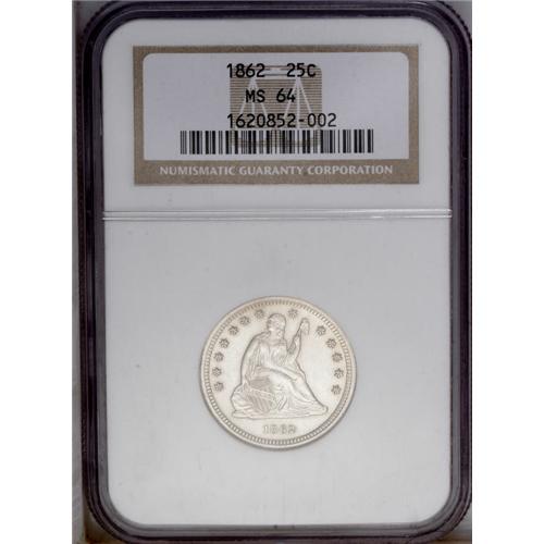 <B>1862 25C MS64 NGC.</B></I> Boldly struck and essentially untoned with faint striations and evidence of die clashing in the obverse fields. An ideal candidate to affordably represent the No Motto type. Census: 32 in 64, 18 finer (1/06).
