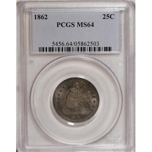 <B>1862 25C MS64 PCGS.</B></I> An elegant, understated Civil War-era near-Gem that offers soft, pleasing luster beneath rich patina. Violet and gold-orange shadings predominate on the obverse, while blue-green toning graces much of the reverse. Population: 39 in 64, 19 finer (1/08).<BR><BR><B>Coin Engraver:</B> Christian Gobrecht<BR><BR><b>Shipping:</b> Coins & Currency (<a target="_blank" href="http://www.heritageauctions.com/common/shipping.php">view shipping information</a>)