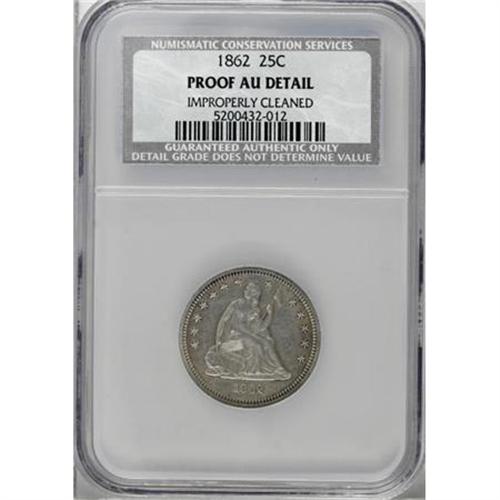 <B>1862 25C --Improperly Cleaned--NCS. AU Details.</B></I> NGC Census: (0/0). PCGS Population (0/0). Mintage: 550. (#5558)<BR><BR><B>Coin Engraver:</B> Christian Gobrecht<BR><BR><b>Shipping:</b> Coins & Currency (<a target="_blank" href="http://www.heritageauctions.com/common/shipping.php">view shipping information</a>)