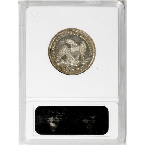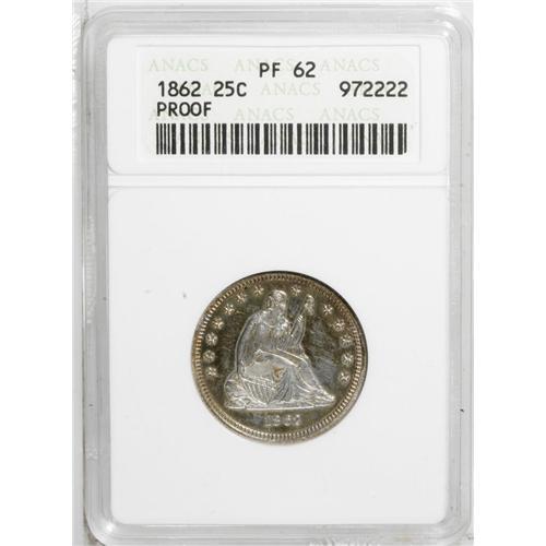 <B>1862<25C> PR62 ANACS.</B></I> Golden-brown and cobalt-blue freckles congregate near the rims. The icy devices approach a Cameo designation. The fields are lightly hairlined. This Civil War date has a proof mintage of just 550 pieces.