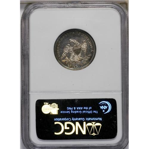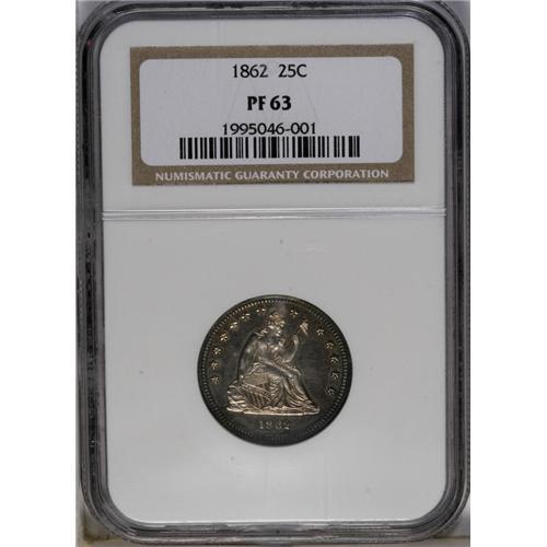 <B>1862<25C> PR63 NGC.</B></I> This coin's predominantly gunmetal fields are reflective with medium mirrors, while the sharply struck devices are light gray. Patches of electric blue and olive toning appear on the reverse; similar blue toning extends from Liberty's head to the rim at 12 o'clock.<BR><I>From The Mulholland Collection.</B></I>