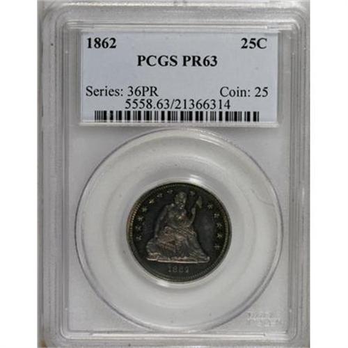 <B>1862 25C PR63 PCGS.</B></I> Deep violet-blue and gold patina graces the luminous surfaces of this sharply struck Civil War proof quarter. The obverse is surprisingly clean for the grade, though a diagonal hairline is visible on the reverse. One of just 550 examples coined.<BR><BR><B>Coin Engraver:</B> Christian Gobrecht<BR><BR><b>Shipping:</b> Coins & Currency (<a target="_blank" href="http://www.heritageauctions.com/common/shipping.php">view shipping information</a>)