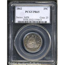 <B>1862<25C> PR65 PCGS.</B></I> One of only 550 pieces produced, this Civil War era proof has deep, variegated blue, lilac, and gold-brown toning throughout both sides. The design elements are razor sharp, and the surfaces appear to be free of noticeable blemishes, save for a hardly noticeable wispy hairline or two. The Gem designation confirms the high quality of this marvelous specimen. Population: 13 in 65, 5 finer (3/04). <BR><BR><B>Important notice:</B> Heritage usually auctions material at the rate of 200-250 lots per hour. On some occasions eBay Live bid software or the Internet may not be able to keep up with the pace of the auction. We recommend placing a realistic absentee bid now as insurance to avoid disappointment. Occasionally the auctioneer may eliminate or reject an eBay Live bid, and the auctioneer may also reopen a lot after the close of the eBay live bidding (usually because we missed an audience bid), and may reject your bid even if it shows you as the winning bidder. By bidding via eBay Live, you agree that Heritage may award the lot to another bidder at its sole discretion under the circumstances described above or any other reasonable circumstances. Since eBay bids are not shown to us until we open the lot on the floor, we treat those bids just like floor bids. In most cases the floor responds before the eBay bid is presented to us, due to Internet lag time, so for consistency we have made it a policy that floor bids are always considered first over tie eBay live bids. Also please note that all Heritage lots purchased through eBay Live carry a 20% Buyer's Premium. Please make sure you read the Terms and Conditions before you bid.