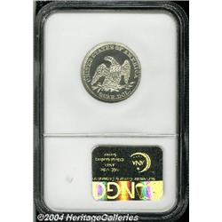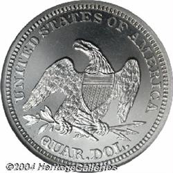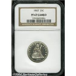 <B>1862<25C> PR67 Cameo NGC.</B></I> This is a Superb Gem Proof example of the No Motto design with fully brilliant obverse and reverse surfaces. Only about 430 Proofs were actually sold in 1862, the balance of the 550 coin mintage being melted. It is the 550 coin figure that continues to be reported in the <I>Guide Book;</B></I> however, we tend to subscribe to Breen's figures in regards to these coins. We offered a similar example in February 2004, when we stated that only two had been certified with none finer. Now that the population indicates four certified, we have to think that this or another was resubmitted a couple times. This is an extremely important opportunity to acquire a rare Proof quarter dollar from the Civil War era. Population: 4 in 67, 0 finer (9/04). <BR><BR><B>Important notice:</B> Heritage usually auctions material at the rate of 200-250 lots per hour. On some occasions eBay Live bid software or the Internet may not be able to keep up with the pace of the auction. We recommend placing a realistic absentee bid now as insurance to avoid disappointment. Occasionally the auctioneer may eliminate or reject an eBay Live bid, and the auctioneer may also reopen a lot after the close of the eBay live bidding (usually because we missed an audience bid), and may reject your bid even if it shows you as the winning bidder. By bidding via eBay Live, you agree that Heritage may award the lot to another bidder at its sole discretion under the circumstances described above or any other reasonable circumstances. Since eBay bids are not shown to us until we open the lot on the floor, we treat those bids just like floor bids. In most cases the floor responds before the eBay bid is presented to us, due to Internet lag time, so for consistency we have made it a policy that floor bids are always considered first over tie eBay live bids. Also please note that all Heritage lots purchased through eBay Live carry a 20% Buyer's Premium. Please make sure you read the Terms and Conditions before you bid.
