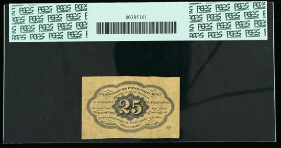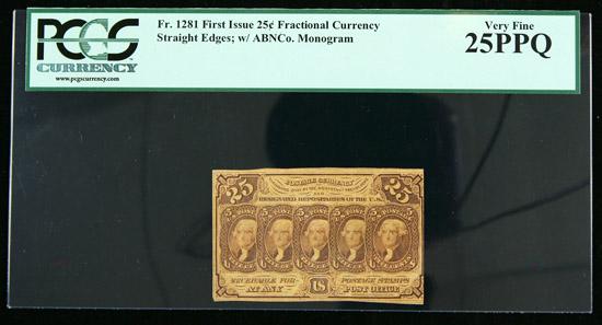 1862, 25¢ Fractional Currency. First Issue, straight edges, with ABCO monogram. PCGS Very Fine 25PPQ. . Fr-1281. A little wrinkly, but at a first glance this piece appears to be much higher grade.