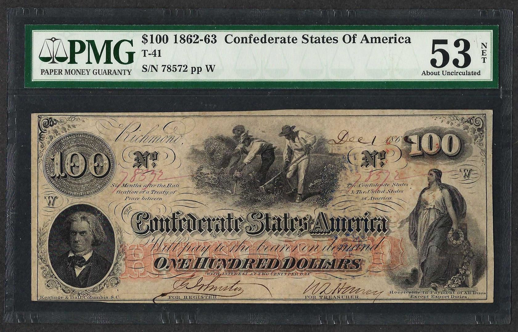 1862-3 $100 Confederate States of America Note T-41 PMG About Uncirculated 53 Ne
