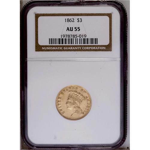 1862 $3 AU55 NGC. A scarce issue, with only 5,750 busi