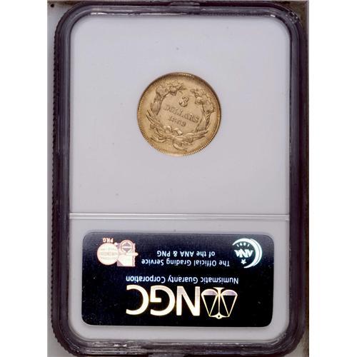 <B>1862<$3> AU55 NGC.</B></I> A scarce issue, with only 5,750 business strikes produced. Yellow-gold surfaces display traces of luster in the protected areas. The design features are well defined, though portions of Liberty's hair are weak. Wispy slide marks are noted over each side. <BR><BR><B>Important notice:</B> Heritage usually auctions material at the rate of 200-250 lots per hour. On some occasions eBay Live bid software or the Internet may not be able to keep up with the pace of the auction. We recommend placing a realistic absentee bid now as insurance to avoid disappointment. Occasionally the auctioneer may eliminate or reject an eBay Live bid, and the auctioneer may also reopen a lot after the close of the eBay live bidding (usually because we missed an audience bid), and may reject your bid even if it shows you as the winning bidder. By bidding via eBay Live, you agree that Heritage may award the lot to another bidder at its sole discretion under the circumstances described above or any other reasonable circumstances. Since eBay bids are not shown to us until we open the lot on the floor, we treat those bids just like floor bids. In most cases the floor responds before the eBay bid is presented to us, due to Internet lag time, so for consistency we have made it a policy that floor bids are always considered first over tie eBay live bids. Also please note that all Heritage lots purchased through eBay Live carry a 20% Buyer's Premium. Please make sure you read the Terms and Conditions before you bid. This lot is being auctioned in conjunction with a live floor auction by Heritage Galleries & Auctioneers. All final auction and invoice information will be supplied by Heritage Galleries & Auctioneers, and all other information should be considered preliminary. Lot:2579 <BR><BR><B>Winning Notification and Billing:</B> After the FINAL session in this auction is complete, Heritage will send e-mail and snail mail invoices. This process normally takes several days. All final auction and invoice information will be supplied by Heritage Galleries & Auctioneers, and all other information should be considered preliminary. <BR><BR>This auction will be conducted on a live auction floor and over the Internet through eBay Live. If you choose to place an absentee bid, please take a moment to <font color='#0000ff'><u><a href='http://pages.ebay.com/liveauctions/help/before/laabsentee.html'>learn how eBay Live absentee bidding works</a></u></font><font color='#000000'>