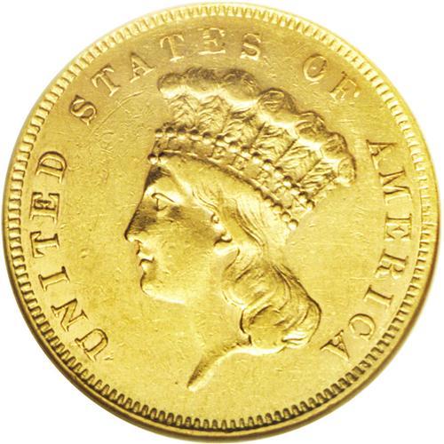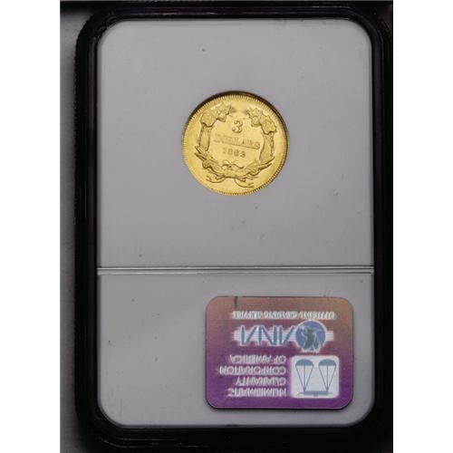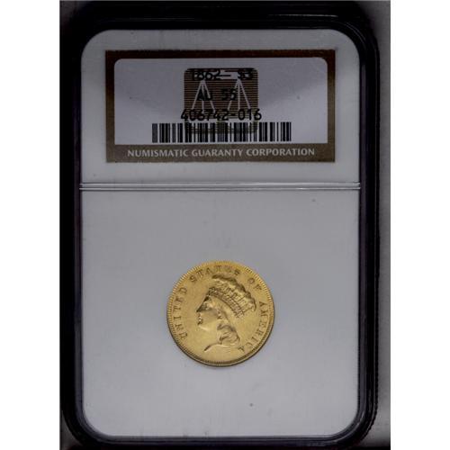 <B>1862<$3> AU55 NGC.</B></I> This Civil War issue, with 5,570 business strikes, is in great demand. Bright yellow-gold surfaces retain luster in the recessed areas, which is complemented by sharply defined design elements; the only hints of weakness occur in portions of Liberty's hair. Some minor marks scattered about are not bothersome. A pleasing Choice AU Three dollar piece.