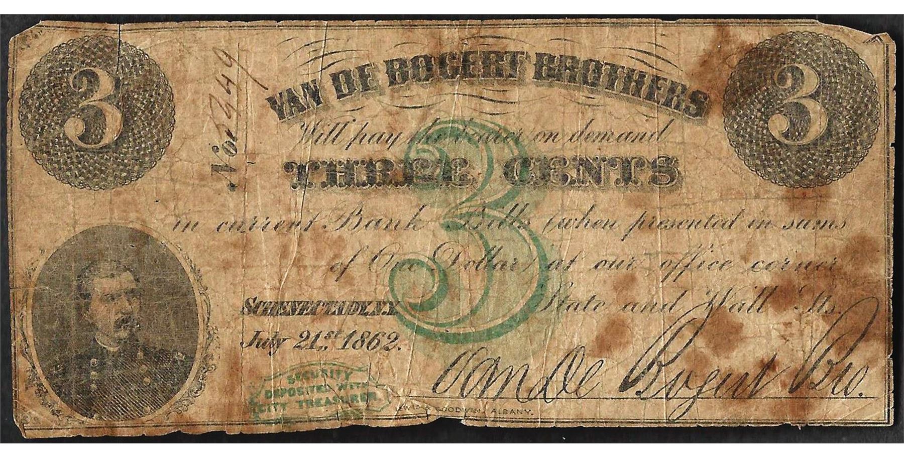 One 1862 3 Cents Van De Bogert Brothers Obsolete Note.